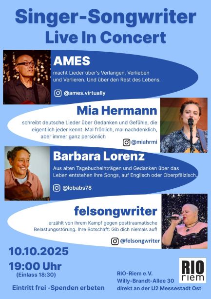 - Singer-Songwriter Live in Concert5 Singer-Songwriter – 1 Bühne. Am Freitag, 06. Juni 2025, hat im Saal des RIO-Riem e.V., ein Konzert mit fünf Künstler:innen stattgefunden, die ihre eigenen Songs und verschiedene Coversongs darboten.… Singer-Songwriter Live in Concert weiterlesen
