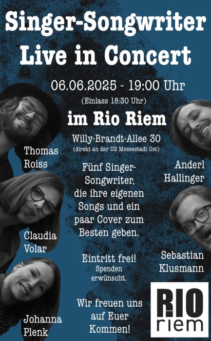 Am Freitag, 06. Juni 2025, hat im Saal des RIO-Riem e.V., ein Konzert mit fünf Künstler:innen stattgefunden, die ihre eigenen Songs und verschiedene Coversongs darboten. Berührende Musik, mit Stimme, Gitarre, Piano und ganz viel Persönlichkeit. Akustische Sets mit Tiefgang und Energie – quer durch die Genres, mal harmonisch, mal wild, mal sanft, mal laut.
